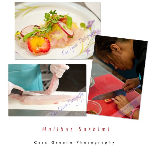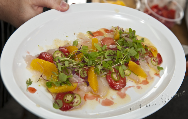Chef Chad is featured here in my food blog,  he prepared Halibut sashimi,pickled strawberries, meter lemon, orange, baby celery and micro citrus greens, and Serano hot peppers.    He demonstrated how to fillet, skin and de-bone the fresh catch of the day and a little information about the exuberant baby celery, peppers and pickled strawberries.