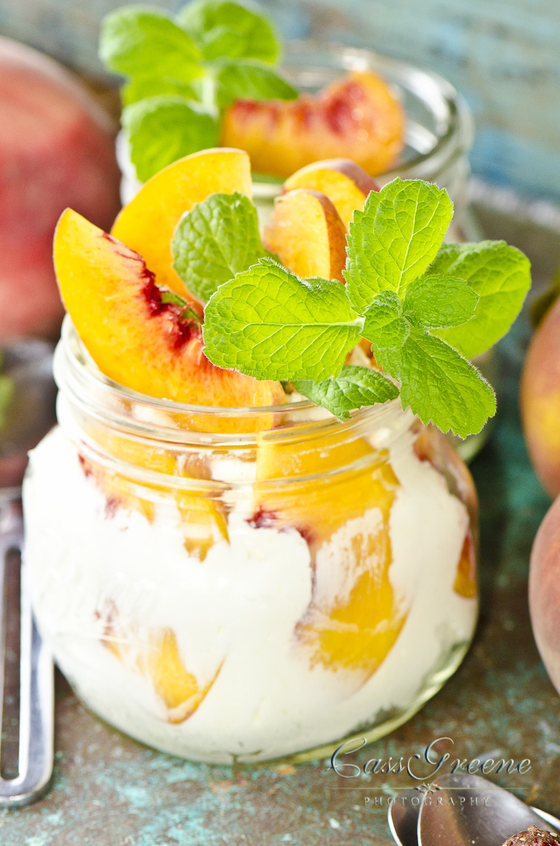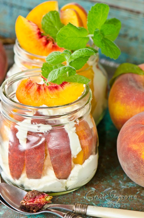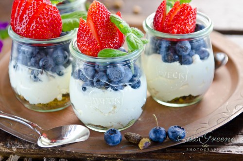 I made a light little dessert of crushed Pistachios layered on bottom, then mascarpone cream, fresh blue berries, topped with strawberry and mint… put them in refrigerator and topped with a dark chocolate almond Bark … served chilled and so easy!