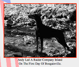 The most outstanding incident of the First Marine Dog Platoon’s record on Bougainville came on November 14, with Andy (a Dobie) and his handlers as the principals. Andy was the Doberman who had led the Raiders inland on the first day: he was popularly referred to as “Gentleman Jim” because of his aristocratic demeanor and aloofness with the other dogs.